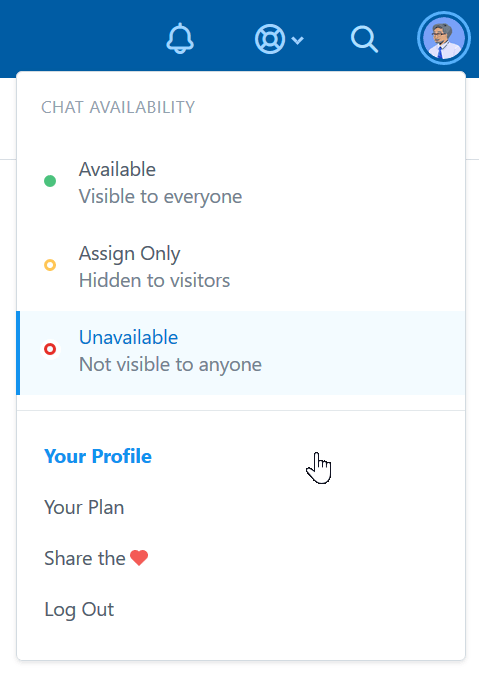 Click the Account icon in the top right corner of Help Scout, followed by the Your Profile option.