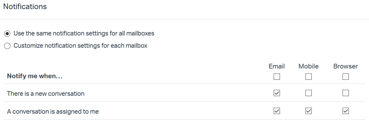 Check the events you'd like to get a notification for, then hit the blue Save Notifications button at the bottom of the page. You can also select options at the top of the page to customize notifications per mailbox, or apply the same settings for all mailboxes you have access to.