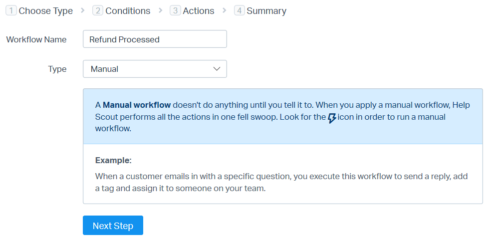 Name your workflow and choose Manual from the Type dropdown. Click Next Step.