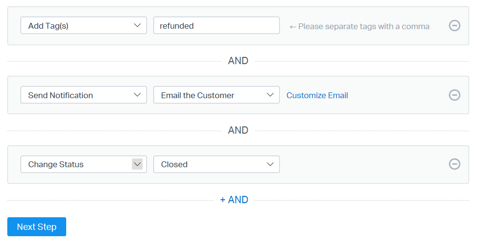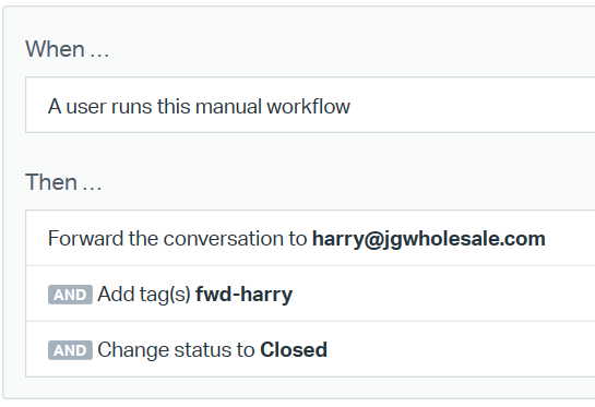 You regularly get emails that need to be forwarded to someone who doesn't work in Help Scout with you. You can set this workflow up to forward the email out, tag it so that you can find all of these emails later, and change that status to Closed.