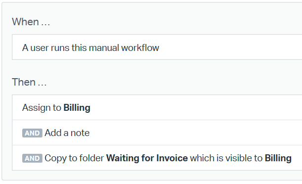 Your customers need to have invoices created by a different team and you want to remind your Billing team remembers to check a specific box when they create that invoice. You can use a manual workflow to assign the conversation to your Billing team, leave a note to remind them to check the tax-exempt box, and then copy that conversation to a folder that only the Billing team sees.