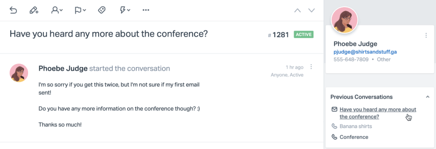 For example, you received an email from Phoebe and Rahul, both from the same company, asking the same question. Change the conversation that belongs to Rahul to belong to Phoebe (see Change the Customer on a Conversation), and then you'll find then that you can merge the two conversations together. Make sure to add Rahul as a CC so that you're replying to both of them!