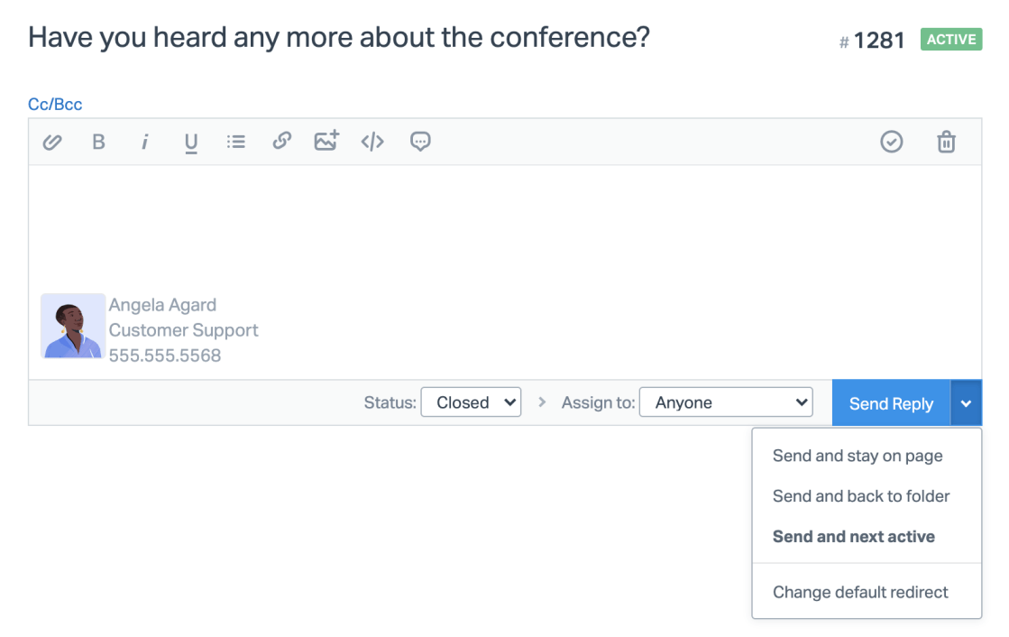 - Send and next active will take you to the next active conversation in the queue, following your sort options.