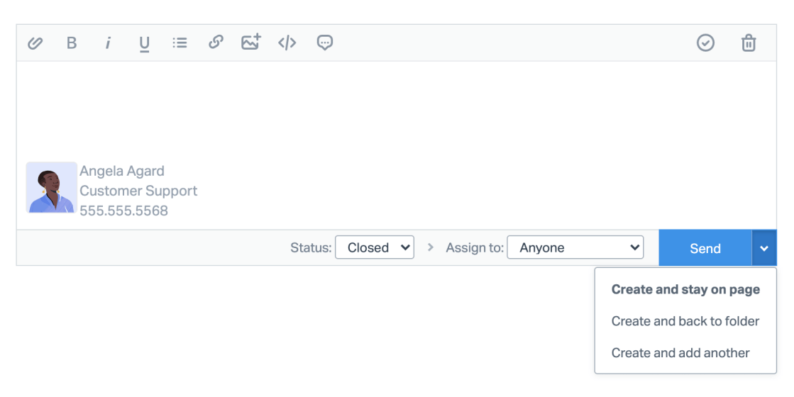 - Send and stay on page will send your reply and reload the same conversation.