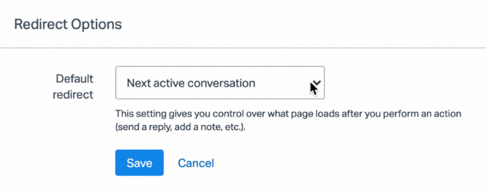 Redirect options in Help Scout refer to deciding where you land next after you have taken action on a conversation. Each Help Scout user can choose a different redirect option manually each time they complete an action, and can customize the default redirect action to suit their personal preference.