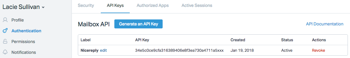 You'll need your Help Scout API key to get started. Head over to your profile page in Help Scout and click on the Authentication section located on the left-hand sidebar, and select the API Keys tab. Click on the blue Generate an API Key button. Copy your new key to the clipboard and tab over to Nicereply.
