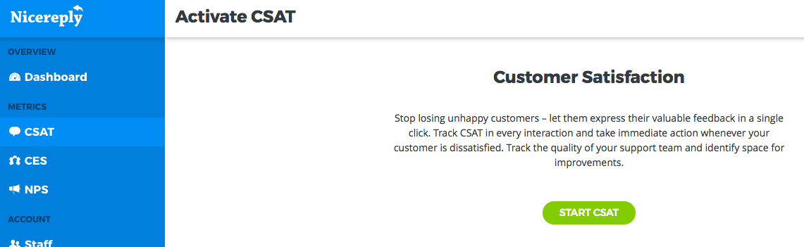 Log in to your Nicereply account and click on the CSAT section located in the left-hand sidebar. From there, click on the green Start CSAT button.