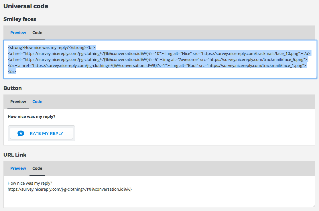 On the next page, select which ratings template that you'd like to use and copy the code by clicking the Code tab for the format of your choice. In the example below, we've chosen the smiley faces option.