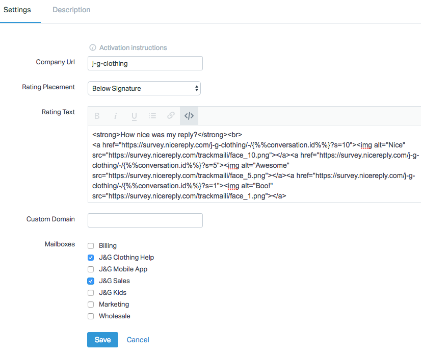 Your ratings link will be included in the signature of replies sent via your selected mailboxes. Lastly, you can also plug in a custom domain if you've got that set up on Nicereply. Make sure to hit Save.
