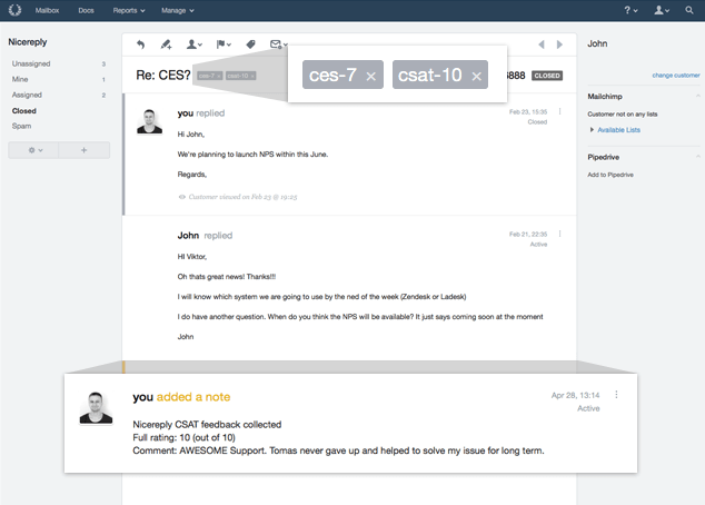 Nicereply is a simple tool for collecting satisfaction ratings from your customers. By embedding a ratings link into your signature, customers can rate each reply you send. Here's a snapshot of how it will appear in Help Scout: