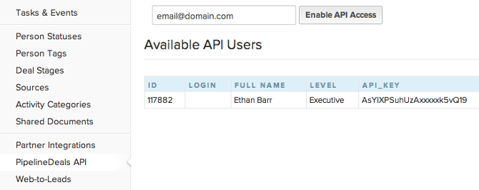 From the sidebar on the Account Settings page, select the Pipeline API option at the very bottom. Enter an email address to enable API Access & then copy the key and head over to Help Scout.