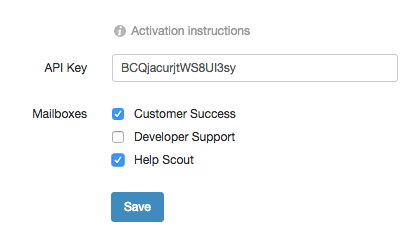 From Help Scout, install the PipelineDeals app. Just paste your API key in to the corresponding field, select which mailboxes you'd to connect, then click on the blue Save button.