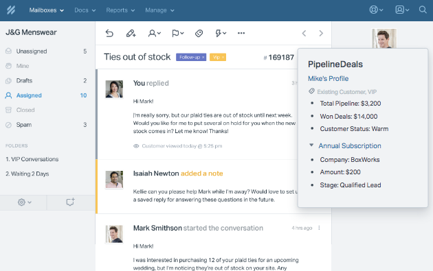 Once installed, the Pipeline app for Help Scout will automatically sync data between your Pipeline and Help Scout accounts, helping to build out and manage your business's customer base. The app also displays a customer's current pipeline value, overall lifetime value and status - as well as up to three deals & their key data points: company name, deal value, pipeline stage and expected close date. Check out the snapshot below of how it will appear below in Help Scout: