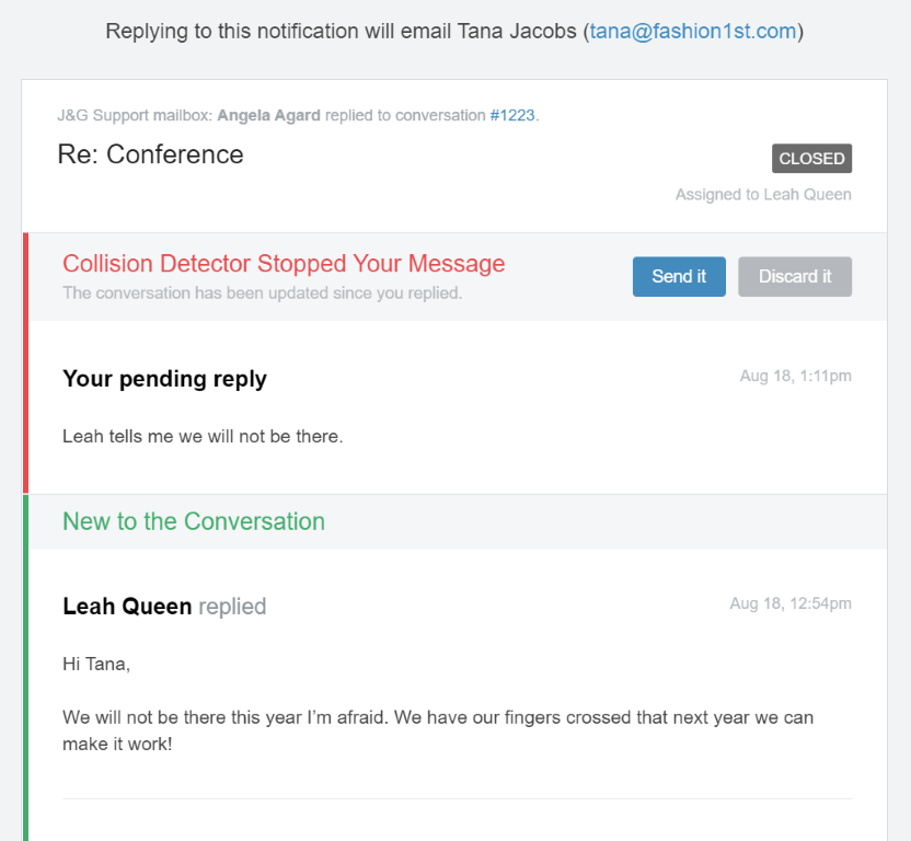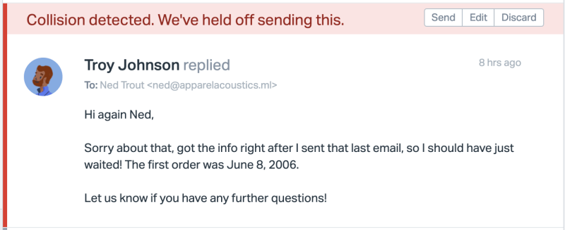 Click into the conversation to take further action. The reply thread in question will have a red border and you'll see a notification at the top that tells you Collision detected. We've held off sending this. Click Send to send the message as is, click Edit to make changes, or click Discard to delete the reply altogether.