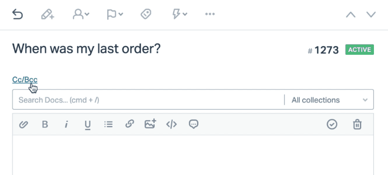 Check out Send Article Links With the Docs Search Bar for more on this handy way to quickly add Docs information to your replies. Don't see this bar when you hit Reply? The section Toggle Docs Search Bar On or Off will help you turn this on.