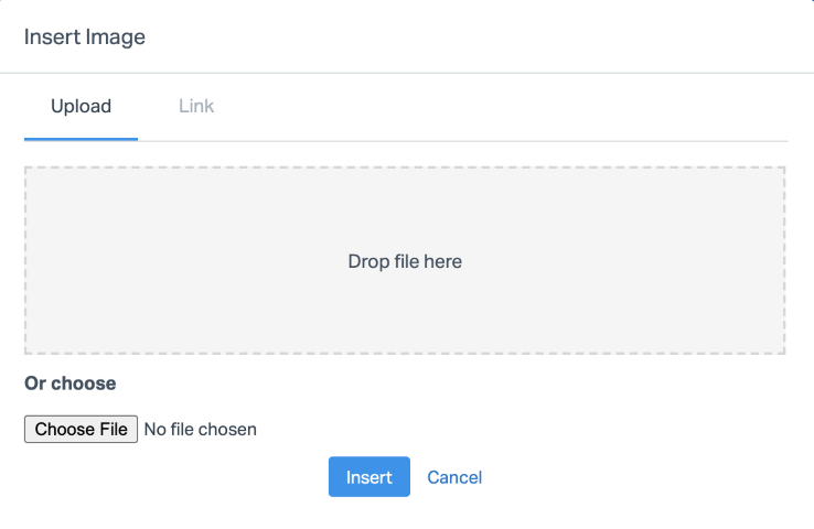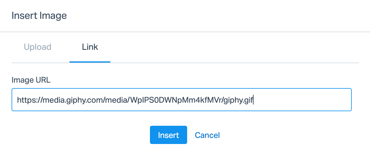 To insert an image that is publicly hosted somewhere (e.g. an animated gif hosted on Giphy), click the Link tab and paste in the full URL for that image. Make sure that your URL ends with an image extension such as .gif, .png, or .jpg, as this will only work with direct links to image files.