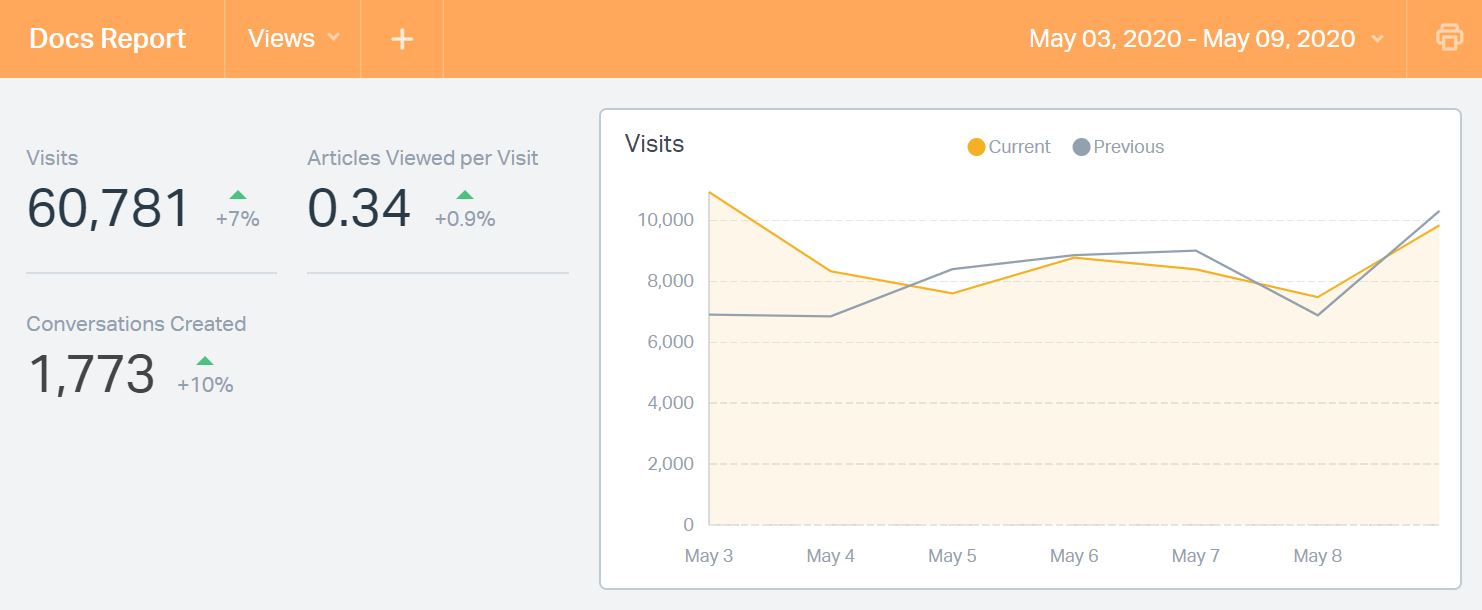 Take a look at the Visits count. If it's lower than expected, you might consider adding a link to your Docs site in your email signature, to an email blast, or just changing where the Docs link is located on your website. Implement Beacon to allow quick searches from every page and even tailor the suggested articles by page. If your goal is lead with self-service and drive customers to do a bit of digging before contacting support, your Docs site and Beacon should be visible and easily accessible.