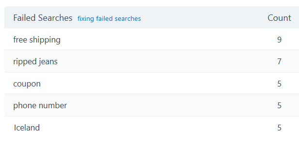 The Failed searches table shows you a list of common terms and search phrases your customers are using to search for articles. If you start to see a trend in failed searches, or high counts for certain terms, it might be time to write more articles, or simply re-word some of your article titles to make them more specific. It's also worth adding keywords to your articles to boost them in search results.