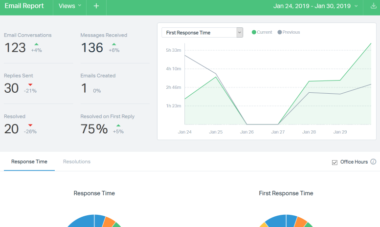 Our Email report measures efficiency working with email conversations. You'll be able to keep track of how your team is performing in terms of time spent addressing and responding to conversations.