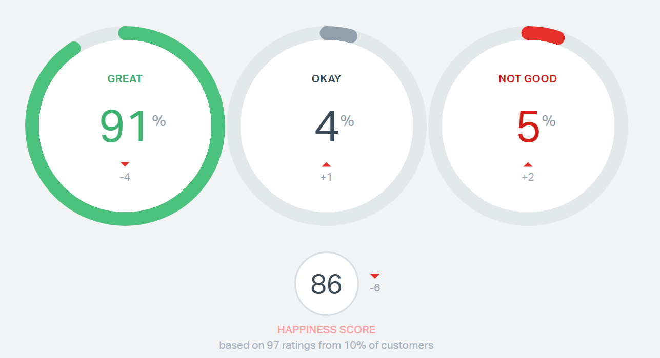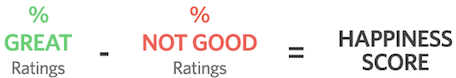 Our Happiness Score is calculated much like NPS. You take the % of Great ratings and subtract the % of Not Good ratings to get the Happiness Score.