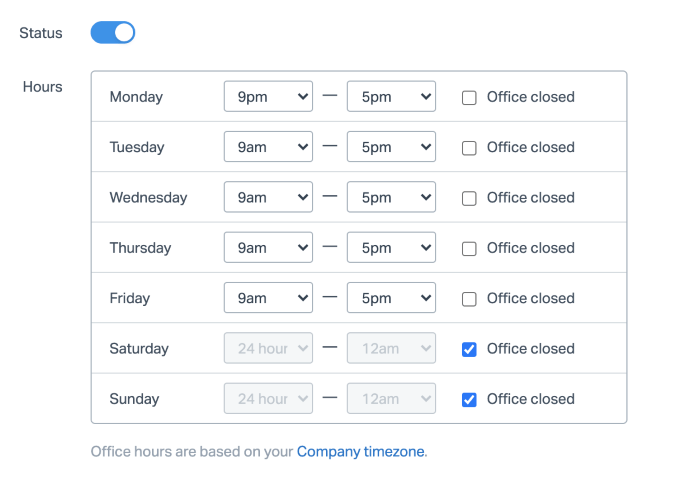 Toggle Status on, and enter your hours of operation for each day of the week your business is open. Check the Office closed checkbox for any days that your business is closed.