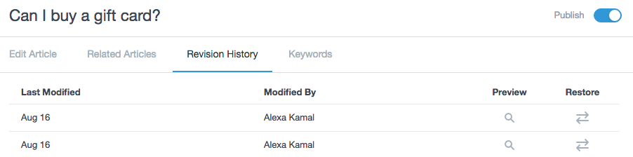 Since multiple people edit and publish the same article from time to time, it's helpful to see what's changed between edits. We keep track of published revisions for all of your articles. Just click the Revision History link under the article title to preview (or restore) the past 25 revisions. New revisions are saved each time an article is published.