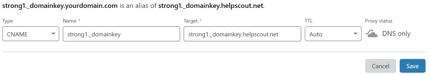 - strong1._domainkey.yourdomain.com will point to strong1._domainkey.helpscout.net