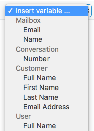 When editing saved replies, workflow emails, the mailbox signature, or your auto-reply, you'll find a dropdown list of valid variables in the top-right corner of the editor. To insert a variable, just open the menu and pick one from the list.