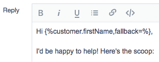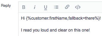 For example, say that you want to automatically insert the customer's first name in a saved reply. Using the {%customer.firstName%} variable will automatically populate the customer's first name when the reply is sent; that way, you don't have to type it out manually when the editor is open. Remember to place all variables between a curly bracket and a % sign.